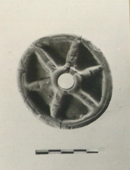 | Description: | Originally identified as lid. Complete, but broken in four pieces. Wheel-like disk with hole in center to help in lifting rim. Brownish-buff clay. ADDENDA Probably a wheel for a toy. Cf. RT 758 (Τ 1661) to RT 773, especially RT 769-770 [3 Jan. 1957]. | |
