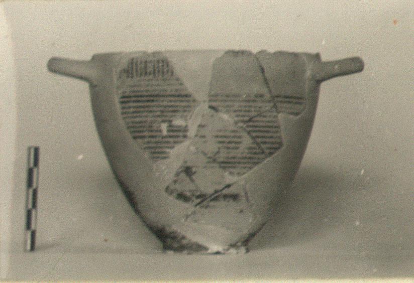 Description:   Several fragments put together in two main groups give the foot with part of the lower wall, and a little of the rim and upper wall, also one handle. Restored in plaster. Low ring foot. Below rim, straight strokes, then narrow horizontal bands, then solid glaze to the foot with two reserved bands.