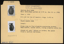 | Description: | Intact. Plump olpe; flat, slightly projecting bottom; band handle, rather short, rising slightly above rim. Glazed all over, except on bottom; the glaze fired a uniform red-brown. | |