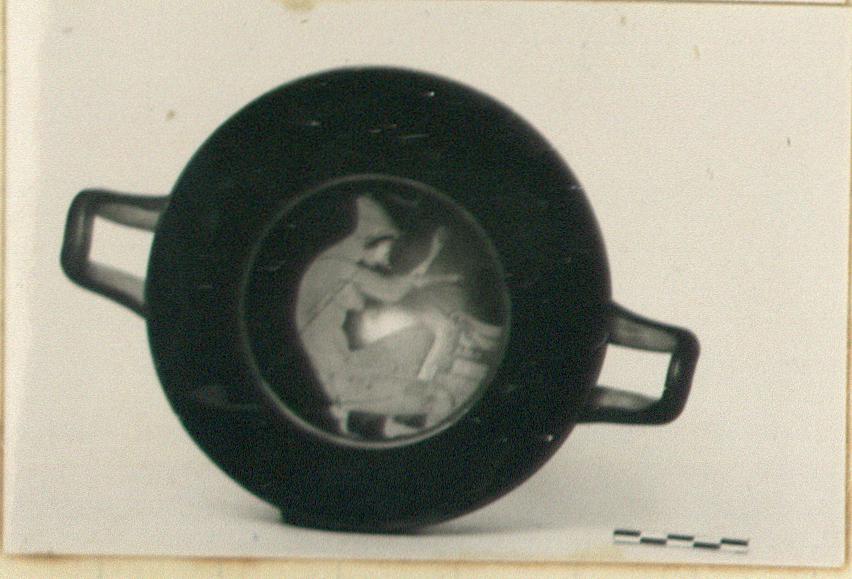 Description:   Mended from many pieces; missing a little of the rim and floor, and chips from the tondo (woman's face). Thick disk foot. A reserved band around the tondo. Within, a naked woman, right, kneeling on her right knee in front of a burning altar, towards which she holds out a wreath. Sakkos, earrings, necklace. Relief contour; red for wreath and altar flames, and inscription (faded).