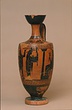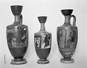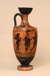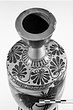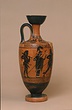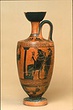 | Description: | Mended from many pieces; a few wall fragments missing. Torus mouth; rim flat on top; shoulder tending to be flat; moulded ring above foot; unusually moulded foot. On shoulder, thin rays and palmettes (two, three, two). Above picture, key leftwards; below, rightwards. A procession of gods approaches the palace of Zeus, which is indicated by a Doric column. From left to right, Herakles, Athena, Hermes, Apollo; then the column, and Zeus seated whithin, holding the thunderbolt. Standing behind him, Hera. Added red and white; glaze thin and brown in places. | |