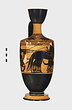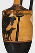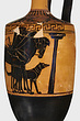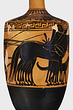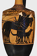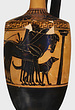 Man mounting chariot, right; himation, greaves, wreath; he holds the reins with both hands and the goad in the right. Near the front legs of the horses and behind them walks a dog. In front of the team, a Doric column. White for the wreath and dots of himation, also patches on the third horse and a stripe on the belly of the dog.