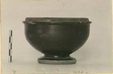 | Description: | Mended from three pieces; small bits of wall missing. Stemmed bowl, round-bodied with a heavy cup foot; narrow horizontal rim and vertical flange to take lid. Thick black glaze, rather unevenly applied. Reserved are: the edge of the foot and the resting surface and the top of the hollow cone beneath, also the outside of the vertical flange, this then painted purple. | |