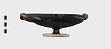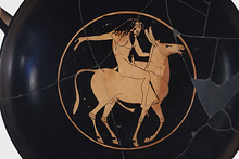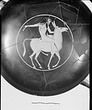 | Description: | Mended from several pieces; fragments missing. Thin foot strongly thickened at the edge; a groove around the upper surface. Inside, a reserved band around the tondo. Within, an ivy-crowned, bearded ithyphallic Satyr on an ithyphallic donkey, right. Inscribed around. Red for inscription and wreath. By Epiktetos. For the three relief lines seen on the amimal's knees, and the stripe on his breast, cf. the signed eye-cup in Leningrad, Leningrad 645: ARV, p. 45, no. 4; JdI 44 (1929), p. 155, fig. 6. | |