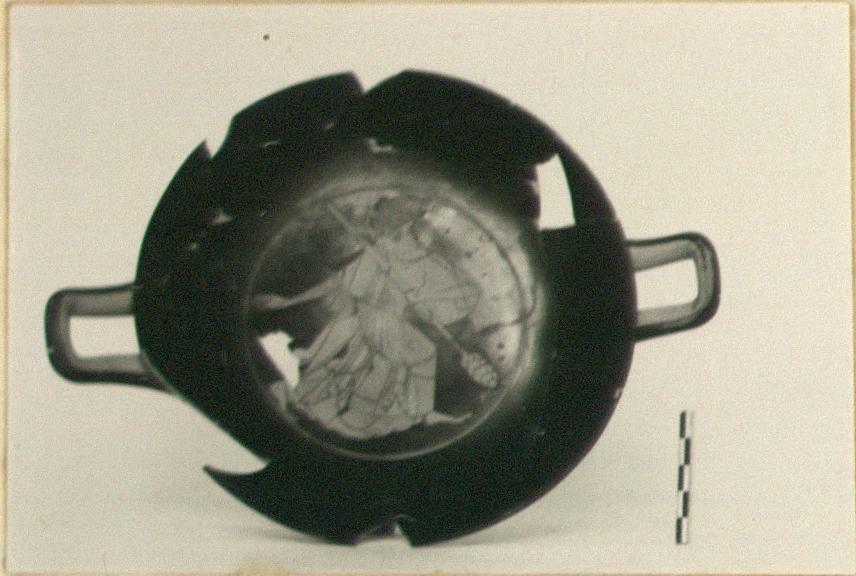 | Description: | Mended from many pieces; the foot missing, fragments of wall and rim, and a little of the medallion. Low stem; ring at junction with foot. Inside, within a reserved band, a maenad running right and looking back; thyrsos in left hand. Chiton, himation, sakkos, earrings and necklace. Inscribed in red: <graphic> For the style cf. P 23165, P 24102, Acr. A 233 (Graef and Langlotz, pl. 13). For the kalos name Chairias, cf. ARV, 918-919. | |