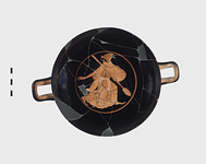 | Description: | Mended from many pieces; the foot missing, fragments of wall and rim, and a little of the medallion. Low stem; ring at junction with foot. Inside, within a reserved band, a maenad running right and looking back; thyrsos in left hand. Chiton, himation, sakkos, earrings and necklace. Inscribed in red: <graphic> For the style cf. P 23165, P 24102, Acr. A 233 (Graef and Langlotz, pl. 13). For the kalos name Chairias, cf. ARV, 918-919. | |
