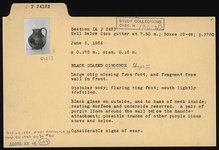 | Description: | Large chip from foot and fragment from wall in front missing. Flaring ring foot; globular body; mouth lightly trefoiled. Black glaze on outside, and to base of neck inside; resting surface and underside reserved. A pair of purple lines around the wall below the handle attachment; possible traces of other purple lines above and below. Considerable signs of wear. Cf. Agora XII, no. 109. | |