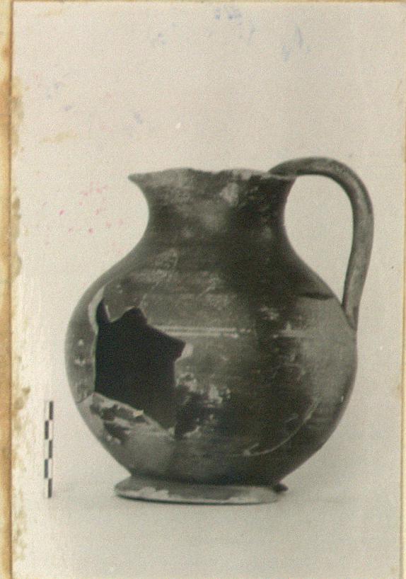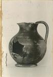 | Description: | Large chip from foot and fragment from wall in front missing. Flaring ring foot; globular body; mouth lightly trefoiled. Black glaze on outside, and to base of neck inside; resting surface and underside reserved. A pair of purple lines around the wall below the handle attachment; possible traces of other purple lines above and below. Considerable signs of wear. Cf. Agora XII, no. 109. | |