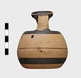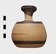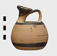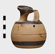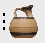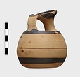 | Description: | Small hole in side; otherwise intact. Small duck askos, with rounded wall and large central opening; spout tilts back to join band handle; shallow bell mouth. Pinkish-buff clay; thin fabric, neatly finished. Black glaze on the mouth inside and out, on the top of the handle, and for a broad band at top and bottom of wall, with a narrow band between. Cf. the series of similar vases from the Heraion at Delos (Délos X2, pls. XVI-XVIII: "Vases couronnés, Rhodo-Ioniens"; the banded decoration as pl. XVI:104). | |