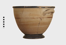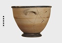 | Description: | Mended from many pieces; complete except for small bits. Small echinus foot; deep bowl; narrow rolled rim, only slightly projecting; rather small handles, set well up towards rim and somewhat uptilted. Firm thick somewhat dull black glaze inside and on rim; thinner on foot. Dilute wash on walls outside; a brown band below the handles. Slight traces of wear on the floor. Cf. Agora XII, no. 1781. | |