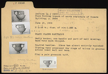 | Description: | Badly broken; one handle and part of wall missing; base very much chipped. Restored in plaster. Spurred handles. Glaze has almost entirely vanished, leaving very prominent the rings of miltos in grooves around lower wall and base. Clay a pale greenish-buff. ADDENDA Probably Corinthian, ca. 325 B.C.? [GRE]. | |