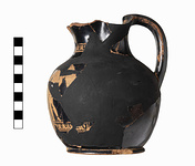 | Description: | The height is preserved nearly to the rim but very much is missing; restored in plaster. Egg and dot border above and below panel; reserved line at sides; at left, a boy, right, poised to jump: arms outstretched, knees bent, feet together; facing him, Eros, standing, holding a staff in his outstretched right hand. No relief contour. | |
