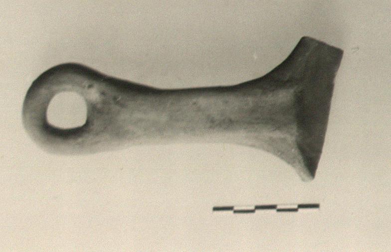 | Description: | [Originally identified as frying pan]. Handle and a small bit of adjacent rim of frying pan preserved. Flat handle, projecting from rim and pierced near its end. Micaceous cooking ware fabric; the part near the pan blackened from use. | |