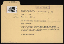 | Description: | Wall fragment. Torso of Athena, facing, with aegis and spear held in her left hand, apparently resting against her shoulder. Trace of some other representation at upper right of fragment. No relief contour. | |
