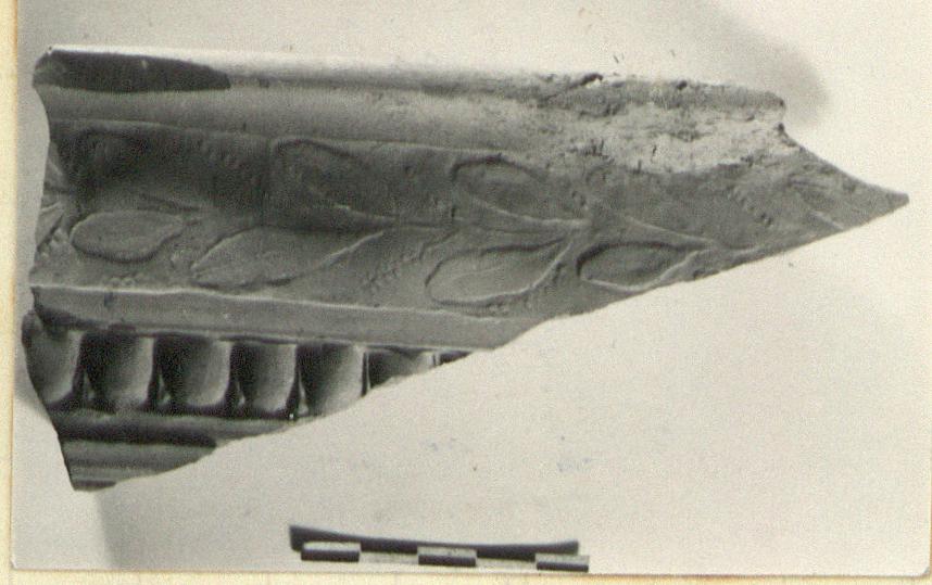 Description:   Fragment of rim only preserved; flat on top. Relief decoration on outside below rim: above, leaves and berries, below ovules and darts.
