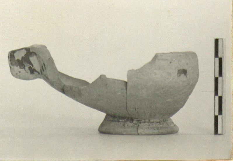 | Description: | Several joining fragments give complete profile, with entire foot. One rim fragment does not join. Open bowl on flaring ring foot; flat-topped rim; ribbon handles with projecting ends. On outside, surface almost all peeled off but rays above the foot and traces of figured ornament (sphinx, recalling Polos style) above. On top of rim, dots. On inside, good firm red glaze with purple bands. | |