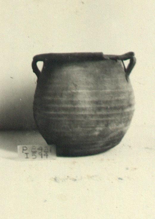 | Description: | Chip missing from rim. Bomb-shaped body, wheel-ridged; no foot; rounded bottom. Flaring rim. Two very small vertical handles. Coarse pinkish clay, fired gray outside; on the inside, red from stacking in the firing. Unglazed. | |