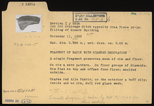 | Description: | A single fragment preserves some of rim and floor. On rim a wave pattern. On floor groups of diamonds. Rim flat on top and offset from floor; moulded outside. Coarse red tile fabric; on the exterior a buff slip; inside and on rim, dull red glaze wash. | |