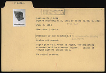| Description: | Broken all around. Upper part of a woman to right, contemplating a casket held by a second figure. Traces of tongue pattern around knob. No relief contour. | |