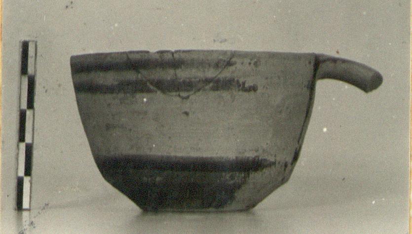 | Description: | Chip from rim broken off and repaired and lower part of handle missing; otherwise intact. Restored in plaster. Flat-bottomed one-handled cup with plain vertical lip. Glaze and decoration as P 24299 (ΚΤΛ 371). ADDENDA P 24299: Poor brownish-black glaze on lower wall outside, on inside, and for bands on inner and outer edge of rim, also for a pair of crossing bands on the outside of the handle. On the wall, to either side of the handle, an irregular vertical band sets off the handle space. Shattered and remended; some lip fragments missing [February 1957]. Restored in plaster [February 1959]. | |