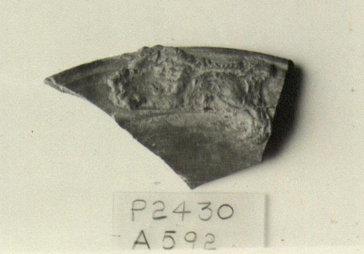 | Description: | Small fragment of the rim of a Late Roman A bowl with gently flaring sides and approximately horizontal rim. A groove near the outer edge of the upper surface; also on the upper surface the relief figure of a wild boar charging left. Red clay; dull red glaze. | |