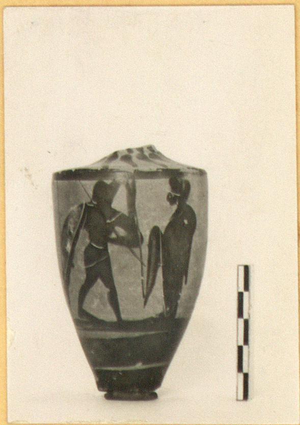 | Description: | Neck and foot missing. General type as P 24316 (ΣΑ 2526): This is the characteristic general type for the large proportion of the lekythoi from this group. Bell mouth with variations in height and spread; lip usually reserved, occasionally glazed. Disk foot of varying thickness; below picture either one or two reserved lines. Added colors more or less well preserved. Only substantial variations are noted in the following descriptions. Scene: warrior moving right (side view of shield); on each side draped figure and spears. Same hand as P 24339 (ΣΑ 2549). | |