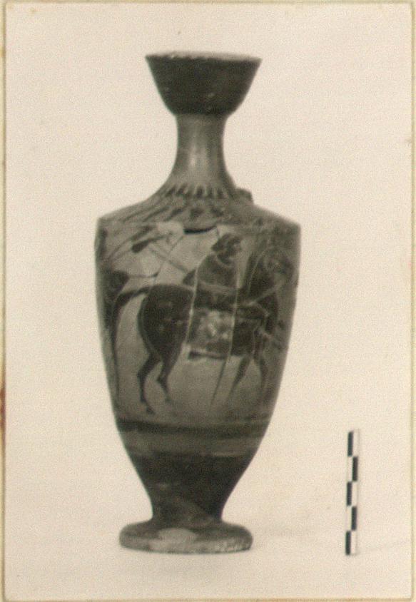 | Description: | Handle and piece from wall missing. General type as P 24316 (ΣΑ 2526): This is the characteristic general type for the large proportion of the lekythoi from this group. Bell mouth with variations in height and spread; lip usually reserved, occasionally glazed. Disk foot of varying thickness; below picture either one or two reserved lines. Added colors more or less well preserved. Only substantial variations are noted in the following descriptions. Shoulder: strokes above lotus bud (skipping three). Scene: horseman in blanket-cloak riding right, followed by a youth holding two spears and himation; bird. | |