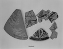 | Description: | Base fragment of large proto-Attic pot. Possibly a sixth of the circumference of the base preserved. Very heavy walls, flaring and rather thicker at the lower edge. From the resting surface it slopes inward, and then a little above half of the preserved height takes an outward flare. The inside of the foot is reserved. On the outside, above a wide glazed band at the lower edge, is a panelled design. At the right, below a cross-shaped design strengthened at the center by a large circle, a set of diminishing chevrons with their apices up. The vertical divisions between the panels and a line edging the field of the design at the bottom are in dilute glaze. Other parts of the decoration are in darker brown-black glaze, verging toward dilute at the edges. Buff clay. | |