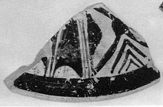 | Description: | Base fragment of large proto-Attic pot. Possibly a sixth of the circumference of the base preserved. Very heavy walls, flaring and rather thicker at the lower edge. From the resting surface it slopes inward, and then a little above half of the preserved height takes an outward flare. The inside of the foot is reserved. On the outside, above a wide glazed band at the lower edge, is a panelled design. At the right, below a cross-shaped design strengthened at the center by a large circle, a set of diminishing chevrons with their apices up. The vertical divisions between the panels and a line edging the field of the design at the bottom are in dilute glaze. Other parts of the decoration are in darker brown-black glaze, verging toward dilute at the edges. Buff clay. | |