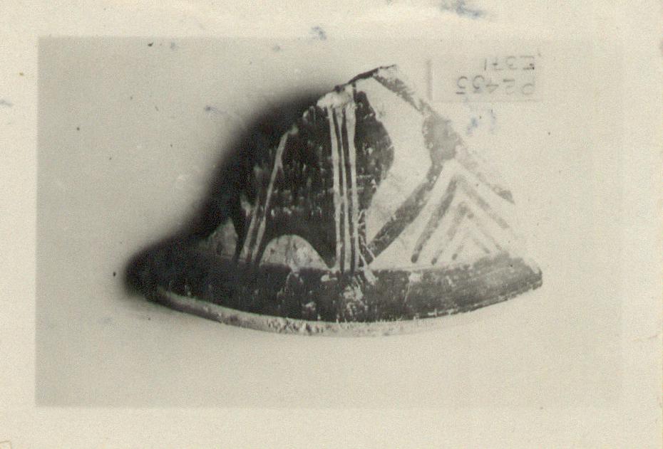 | Description: | Base fragment of large proto-Attic pot. Possibly a sixth of the circumference of the base preserved. Very heavy walls, flaring and rather thicker at the lower edge. From the resting surface it slopes inward, and then a little above half of the preserved height takes an outward flare. The inside of the foot is reserved. On the outside, above a wide glazed band at the lower edge, is a panelled design. At the right, below a cross-shaped design strengthened at the center by a large circle, a set of diminishing chevrons with their apices up. The vertical divisions between the panels and a line edging the field of the design at the bottom are in dilute glaze. Other parts of the decoration are in darker brown-black glaze, verging toward dilute at the edges. Buff clay. | |