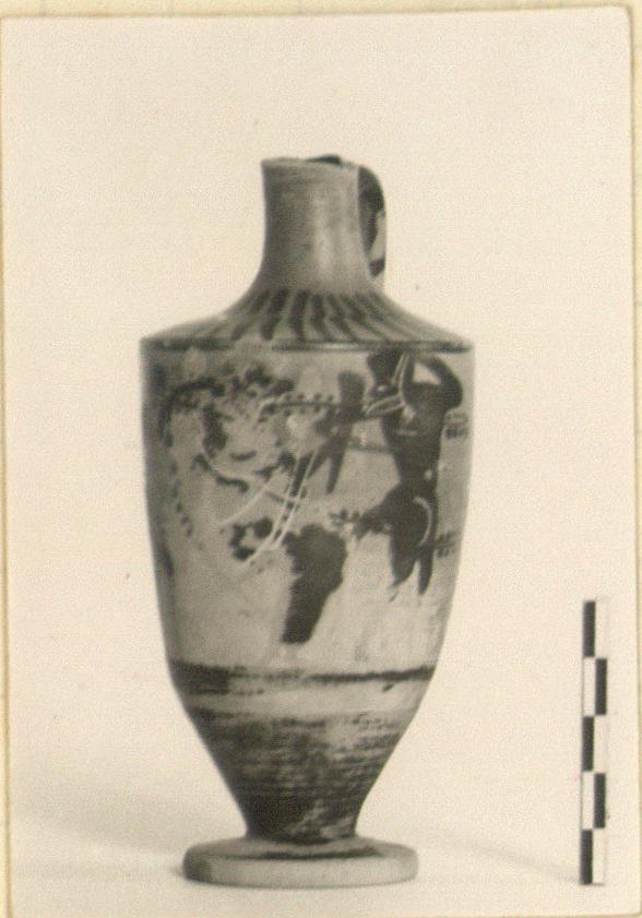 | Description: | Mouth and neck missing. General type as P 24316 (ΣΑ 2526): This is the characteristic general type for the large proportion of the lekythoi from this group. Bell mouth with variations in height and spread; lip usually reserved, occasionally glazed. Disk foot of varying thickness; below picture either one or two reserved lines. Added colors more or less well preserved. Only substantial variations are noted in the following descriptions. Shoulder: strokes above rays. Scene: Dionysos seated right holding horn; on each side, Satyr holding wreath. For style, cf. P 24412 (ΣΑ 2622). | |