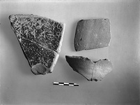 | Description: | Fragment from wall of a large pot, black glaze inside, reserved outside, except for a black band. Incised on the interior: <graphic> Quite pink clay; thin black glaze. | |