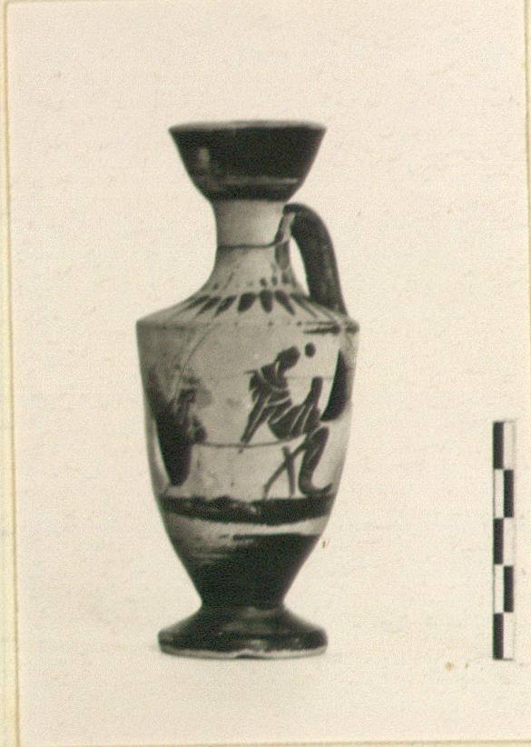 | Description: | Fragments from wall missing. General type as P 24316 (ΣΑ 2526): This is the characteristic general type for the large proportion of the lekythoi from this group. Bell mouth with variations in height and spread; lip usually reserved, occasionally glazed. Disk foot of varying thickness; below picture either one or two reserved lines. Added colors more or less well preserved. Only substantial variations are noted in the following descriptions. Shoulder: strokes above rays. Scene: Dionysos seated between seated women; all three to right. Same hand as P 24442 (ΣΑ 2652). | |