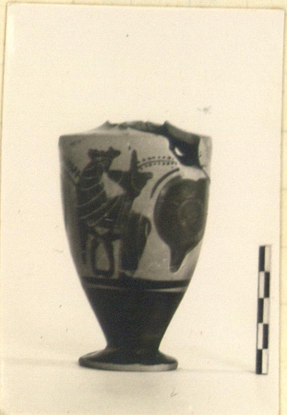 | Description: | Mouth, neck, handle, small upper wall piece, bottom missing. General type as P 24316 (ΣΑ 2526): This is the characteristic general type for the large proportion of the lekythoi from this group. Bell mouth with variations in height and spread; lip usually reserved, occasionally glazed. Disk foot of varying thickness; below picture either one or two reserved lines. Added colors more or less well preserved. Only substantial variations are noted in the following descriptions. Shoulder: rays. Scene: Dionysos, holding kantharos, seated right between eyes. | |