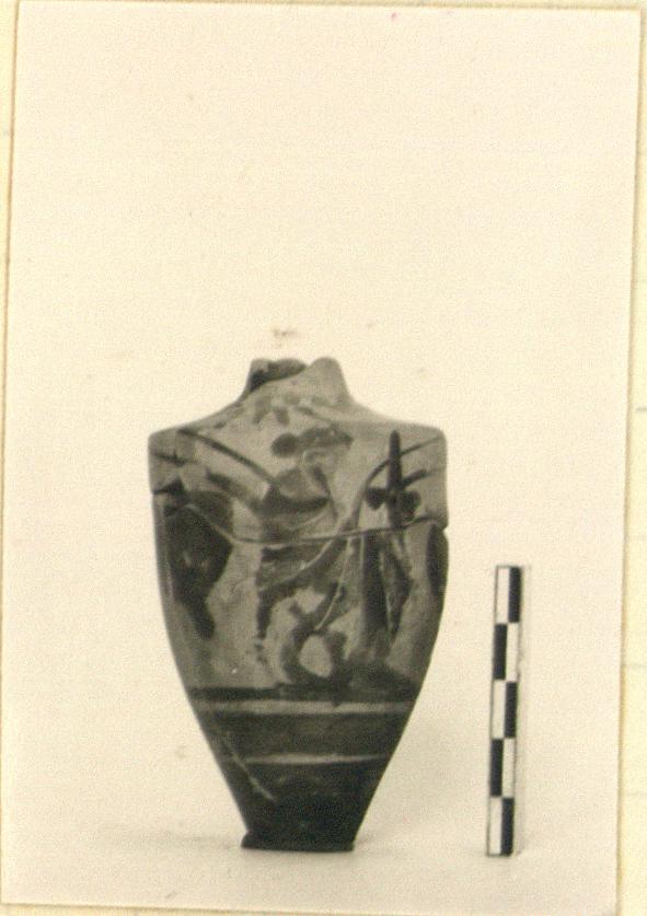 | Description: | Mouth, most of neck, handle, wall fragments and foot missing. General type as P 24316 (ΣΑ 2526): This is the characteristic general type for the large proportion of the lekythoi from this group. Bell mouth with variations in height and spread; lip usually reserved, occasionally glazed. Disk foot of varying thickness; below picture either one or two reserved lines. Added colors more or less well preserved. Only substantial variations are noted in the following descriptions. Shoulder: dots above rays. Scene: Dionysos, holding kantharos, seated right between eyes. | |