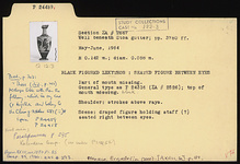 | Description: | Part of mouth missing. General type as P 24316 (ΣΑ 2526): This is the characteristic general type for the large proportion of the lekythoi from this group. Bell mouth with variations in height and spread; lip usually reserved, occasionally glazed. Disk foot of varying thickness; below picture either one or two reserved lines. Added colors more or less well preserved. Only substantial variations are noted in the following descriptions. Top of mouth black. Shoulder: strokes above rays. Scene: draped figure holding staff(?) seated right between eyes. | |