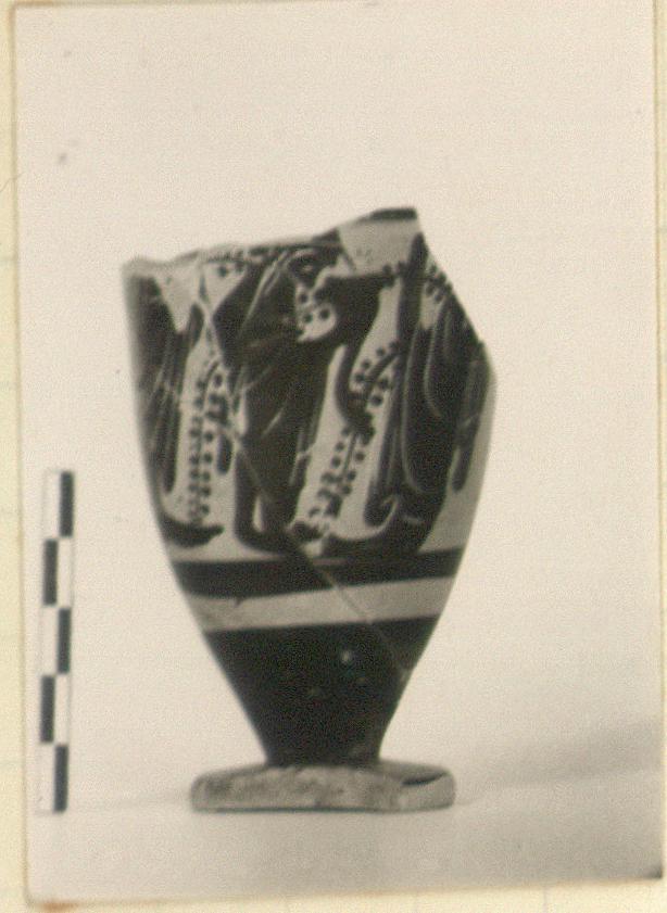 | Description: | Part above shoulder, upper wall piece and foot fragments missing. General type, as far as preserved, as P 24316 (ΣΑ 2526): This is the characteristic general type for the large proportion of the lekythoi from this group. Bell mouth with variations in height and spread; lip usually reserved, occasionally glazed. Disk foot of varying thickness; below picture either one or two reserved lines. Added colors more or less well preserved. Only substantial variations are noted in the following descriptions. Scene: Dionysos, holding horn right, between women. Cf. P 24521. | |