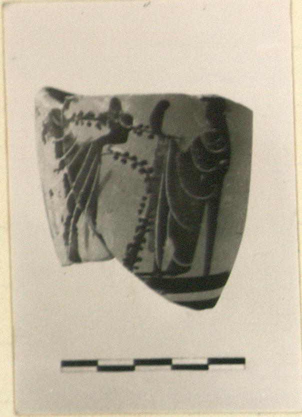 | Description: | All above and below picture missing. Scene: Dionysos standing right, holding a kantharos; on each side, a woman (no white) looking in. | |