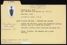 | Description: | Handle and shoulder, and upper wall fragments, missing. General type as P 24316 (ΣΑ 2526): This is the characteristic general type for the large proportion of the lekythoi from this group. Bell mouth with variations in height and spread; lip usually reserved, occasionally glazed. Disk foot of varying thickness; below picture either one or two reserved lines. Added colors more or less well preserved. Only substantial variations are noted in the following descriptions. Shoulder: strokes above lotus bud (skipping two). Scene: Dionysos, two Maenads and a Satyr dancing. | |