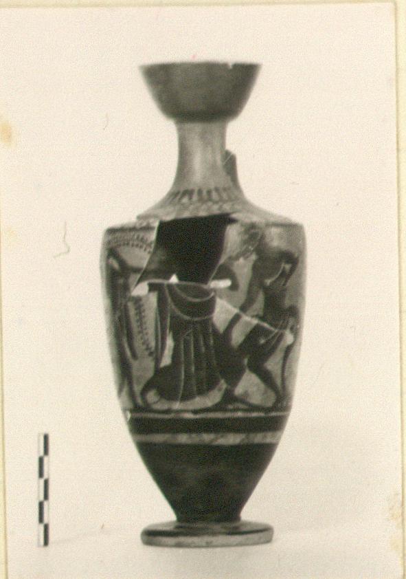 | Description: | Handle and shoulder, and upper wall fragments, missing. General type as P 24316 (ΣΑ 2526): This is the characteristic general type for the large proportion of the lekythoi from this group. Bell mouth with variations in height and spread; lip usually reserved, occasionally glazed. Disk foot of varying thickness; below picture either one or two reserved lines. Added colors more or less well preserved. Only substantial variations are noted in the following descriptions. Shoulder: strokes above lotus bud (skipping two). Scene: Dionysos, two Maenads and a Satyr dancing. | |