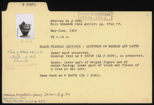 | Description: | Lower half preserved. General type, as far as preserved, as P 24316 (ΣΑ 2526): This is the characteristic general type for the large proportion of the lekythoi from this group. Bell mouth with variations in height and spread; lip usually reserved, occasionally glazed. Disk foot of varying thickness; below picture either one or two reserved lines. Added colors more or less well preserved. Only substantial variations are noted in the following descriptions. Scene: lower part of draped figure and of Satyr facing; lower part of trunk and flower of a tree at the left. Same hand as P 24470 (ΣΑ 2680). | |