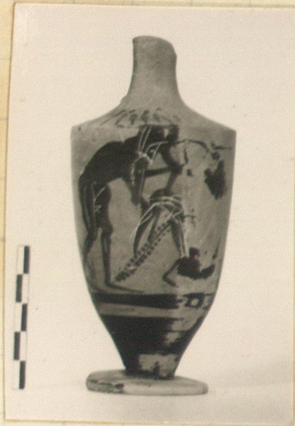 | Description: | Mouth and handle missing. General type as P 24316 (ΣΑ 2526): This is the characteristic general type for the large proportion of the lekythoi from this group. Bell mouth with variations in height and spread; lip usually reserved, occasionally glazed. Disk foot of varying thickness; below picture either one or two reserved lines. Added colors more or less well preserved. Only substantial variations are noted in the following descriptions. Shoulder: strokes above rays. Scene: draped figure, a Maenad(?) between two Satyrs, moving right. | |