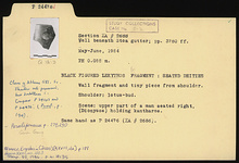 | Description: | Wall fragment and tiny piece from shoulder. Shoulder: lotus bud. Scene: upper part of a man (Dionysos) seated right, holding kantharos. Same hand as P 24476 (ΣΑ 2686). | |
