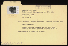 | Description: | Wall fragment. Scene: Theseus kneeling on one knee right binding the bull; garment hanging in field. Same hand as P 24486 (ΣΑ 2696). | |