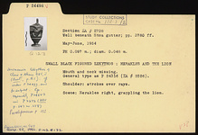 | Description: | Mouth and neck missing. General type as P 24316 (ΣΑ 2526): This is the characteristic general type for the large proportion of the lekythoi from this group. Bell mouth with variations in height and spread; lip usually reserved, occasionally glazed. Disk foot of varying thickness; below picture either one or two reserved lines. Added colors more or less well preserved. Only substantial variations are noted in the following descriptions. Shoulder: strokes over rays. Scene: Herakles right, grappling the lion. | |