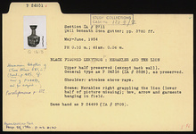 | Description: | Upper half, except back wall, preserved. General type, as far as preserved, as P 24316 (ΣΑ 2526): This is the characteristic general type for the large proportion of the lekythoi from this group. Bell mouth with variations in height and spread; lip usually reserved, occasionally glazed. Disk foot of varying thickness; below picture either one or two reserved lines. Added colors more or less well preserved. Only substantial variations are noted in the following descriptions. Shoulder: strokes above rays. Scene: Herakles right grappling the lion (lower half of picture missing); bow, arrow and garments hanging in field. Same hand as P 24499 (ΣΑ 2709). | |