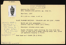 | Description: | Mouth and neck missing. General type as P 24316 (ΣΑ 2526): This is the characteristic general type for the large proportion of the lekythoi from this group. Bell mouth with variations in height and spread; lip usually reserved, occasionally glazed. Disk foot of varying thickness; below picture either one or two reserved lines. Added colors more or less well preserved. Only substantial variations are noted in the following descriptions. Shoulder: strokes above rays. Scene: Herakles right, striking the lion with the club; on each side, a woman running away; bow, arrow and garments hanging in field. Same hand as P 24499 (ΣΑ 2709). | |