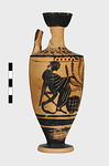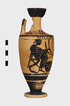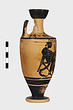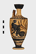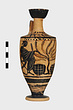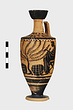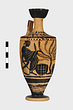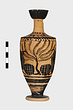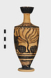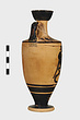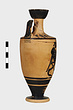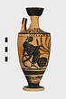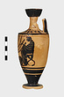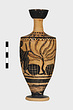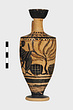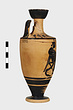 | Description: | Part of handle missing. General type as P 24316 (ΣΑ 2526): This is the characteristic general type for the large proportion of the lekythoi from this group. Bell mouth with variations in height and spread; lip usually reserved, occasionally glazed. Disk foot of varying thickness; below picture either one or two reserved lines. Added colors more or less well preserved. Only substantial variations are noted in the following descriptions. Shoulder: dots above dotted lotus bud (skipping two). Above scene: double row of dots. Scene: two women seated under a tree picking fruit; two round baskets in front of them. The subject occurs on a black figured lekythos in Vienna (739, 6, CVA. Univ. pl. 6,11) attributed to Class of Athens 581; also on one at Eleusis (photo J.T.). Cf. also skyphos fragments from the RRCS Hesperia 15 (1946), pl. 47:97. | |