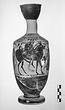 Shoulder: tongues and palmettes with dots (three and two); lotus buds next to handle. A pair of red lines below scene.