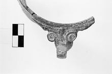 Description:   Mended from four pieces; about a quarter of the rim preserved and a small vertical handle. The sides bulge slightly below a nearly straight rim. The small loop handle has volutes at the top and a leaf-like support below. Below the rim is a horizontal ring of raised dots; from the point of attachment of the handle a spray of laurel(?) in relief falls downward on each side. The colors now much damaged, seem to have been both green and blue.